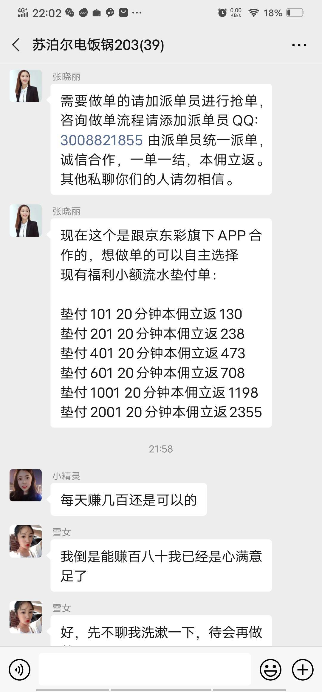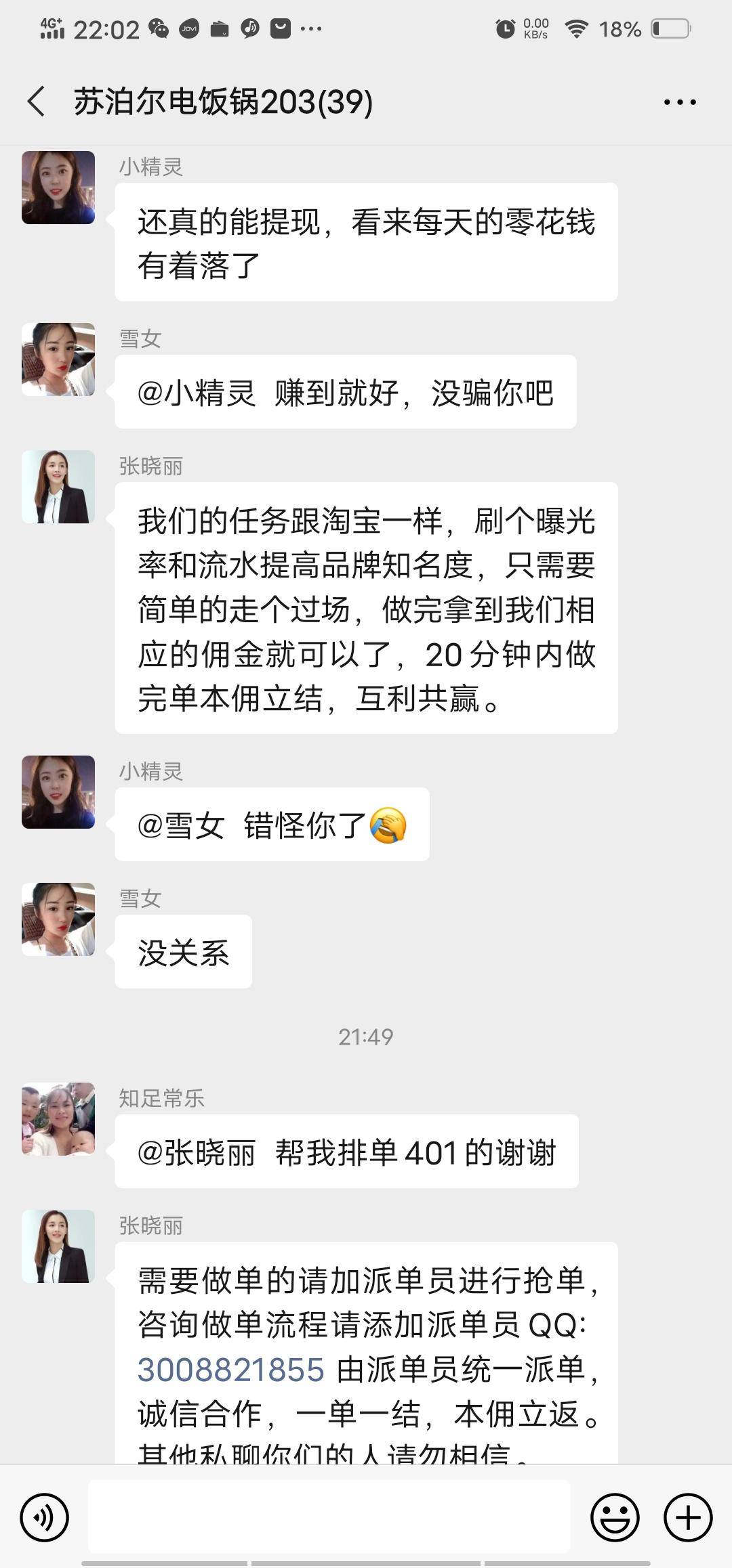 这些人先整一个图片,扫码免费领电饭锅。加了好友后拉你进群,让你兼职刷单(利用免费领取礼品的心态)这些群里都是一群骗子,估计就几个小白在里面,各位朋友们,遇见这样的群千万不要认为很赚钱,都是一步一步的把你套路进去