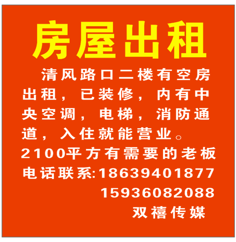 好消息好消息,清风路口二楼有空房出租,已装修,内有中央空调,电梯,消防通道,入住就能营业。2100平方有需要的老板电话联系18639401877,15936082088双禧传媒