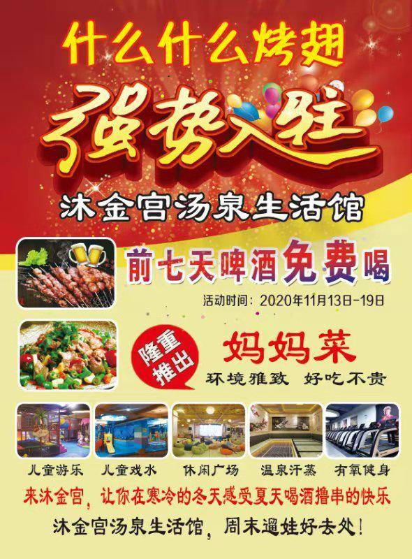 休闲娱乐哪里去,沐金宫汤泉欢迎您!贺什么什么烤翅入驻沐金宫,啤酒免费喝,更有免房间费+门票活动重磅来袭!