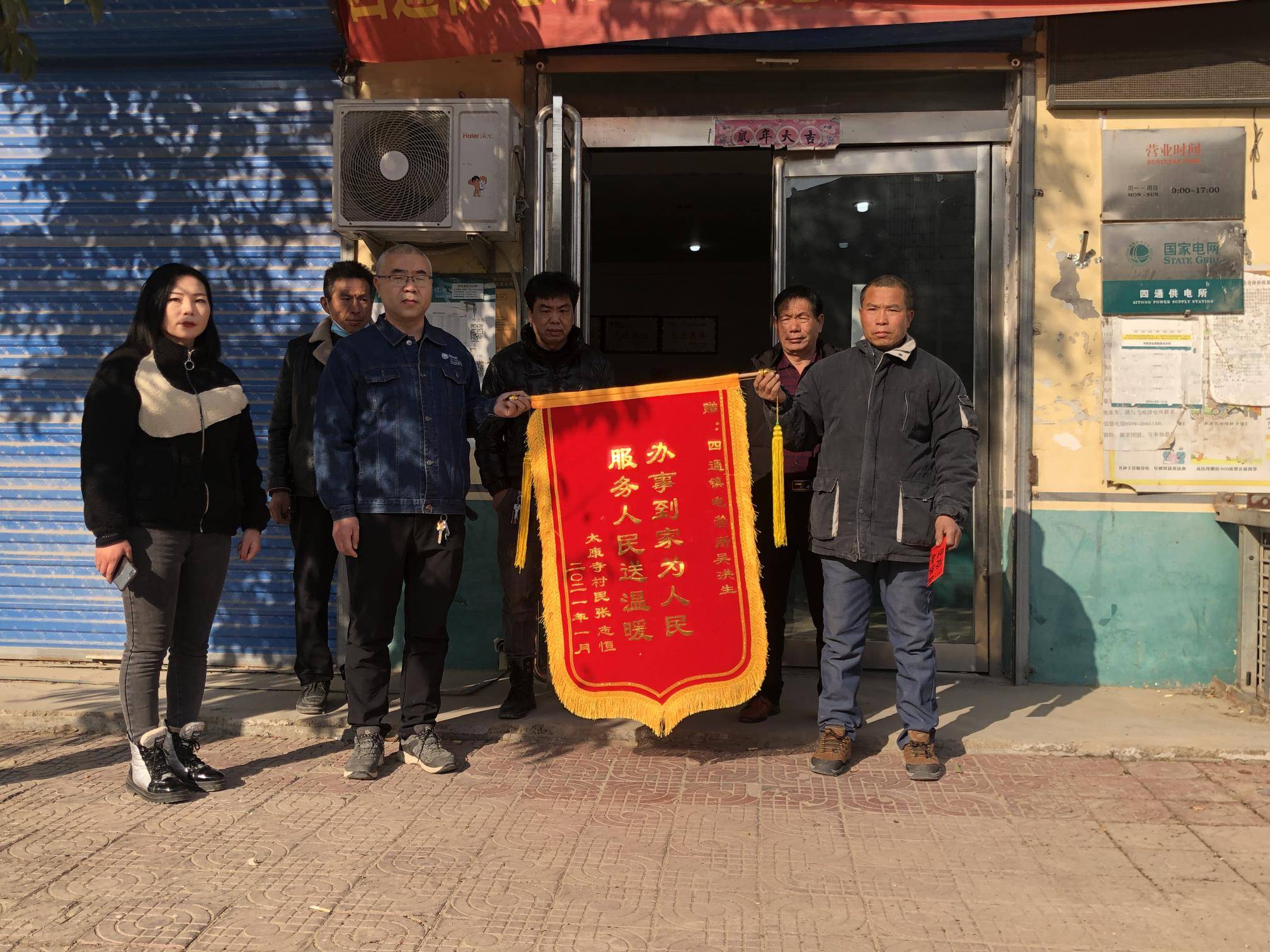 1月19日下午,淮阳区四通镇太康寺行政村村委会书记张宪峰和村民张志恒及其亲友到淮阳供电公司四通供电所将锦旗和感谢信送到供电所员工吴洪生手中,向他勇闯火场救人这一壮举表示感谢。